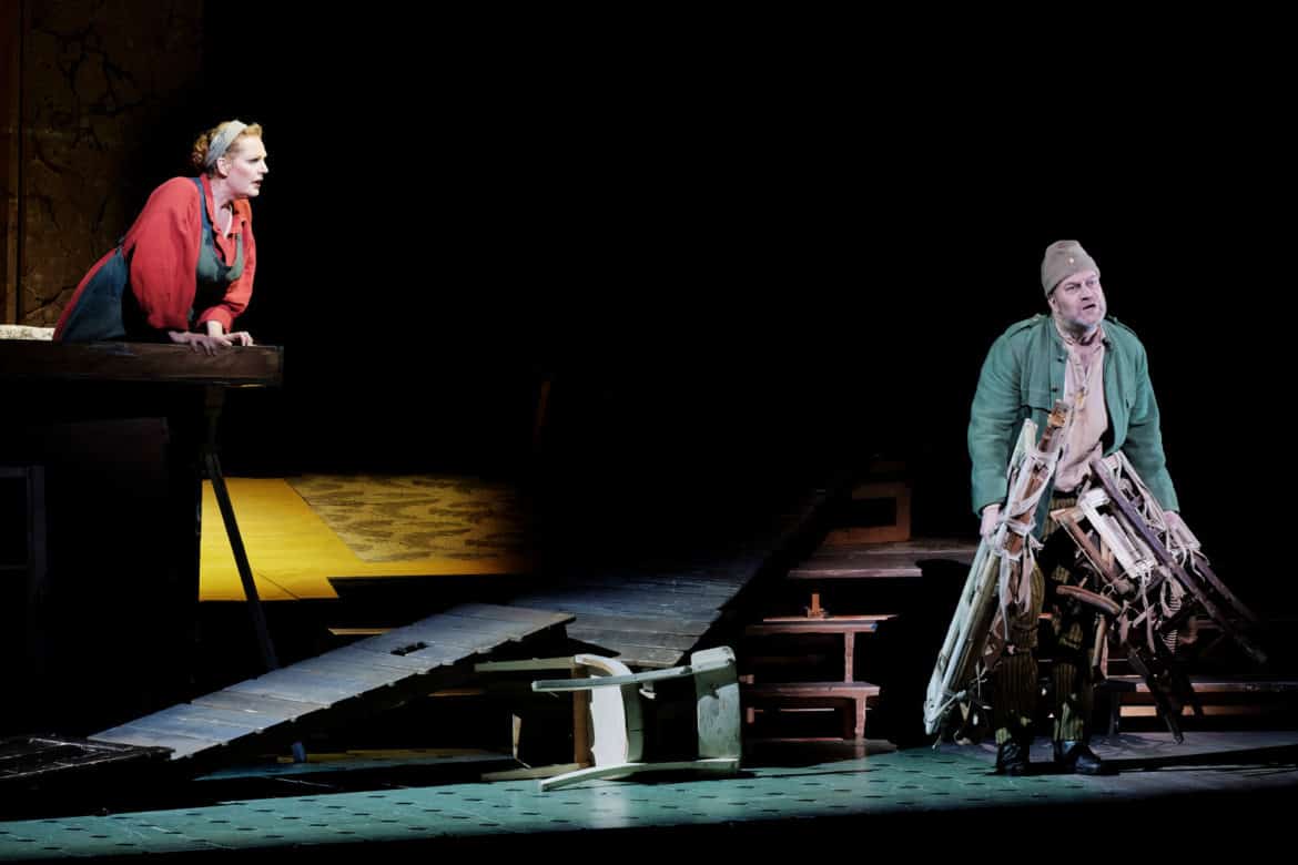 La mise en scène de William Kentridge fonctionne sur la base d’un décor unique – fatras de meubles, chaises et escaliers- qui est le décor mais aussi une surface capable de recevoir des projections. Au travers de films muets de l’époque et de dessins au fusain réalisés par Kentridge lui-même, il précipite le spectateur sur les lieux du drame, la forêt, la taverne ou l’étang où Wozzeck va se noyer mais aussi dans les pensées du soldat qui se bousculent dans sa tête. Ce que nous voyons surtout dans ces images, c’est l’horreur de la guerre et son cortège de brutalités et de violence, de champs de bataille, de ruines d’hôpitaux de guerre et de gueules cassées. On y ressent aussi les traumatismes, les blessures du corps et de l’âme, plaies ouvertes à la guérison incertaine.