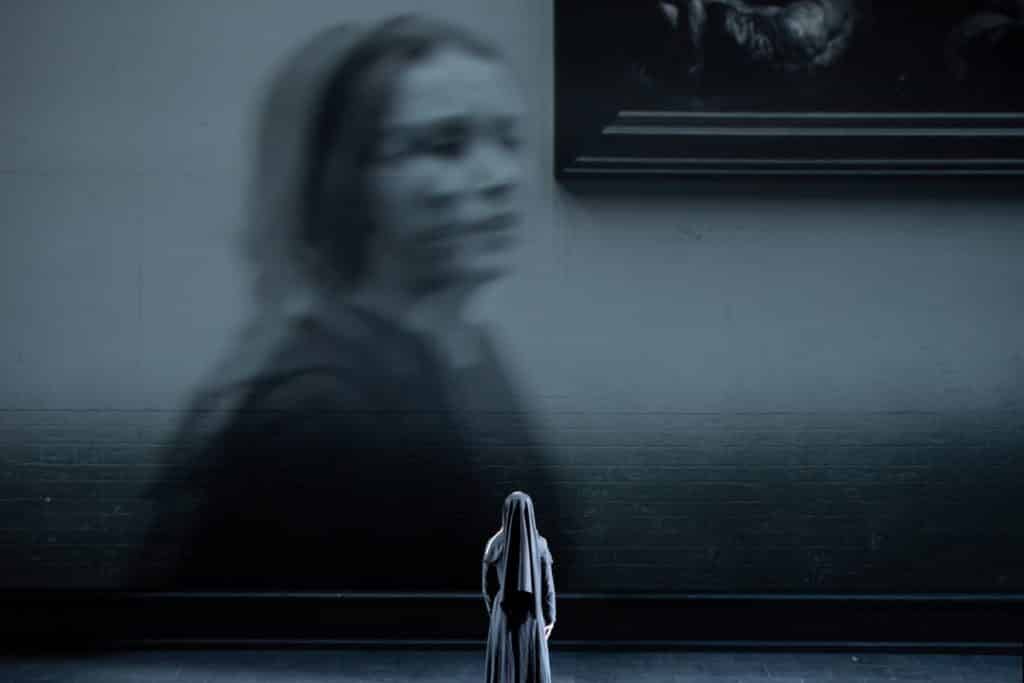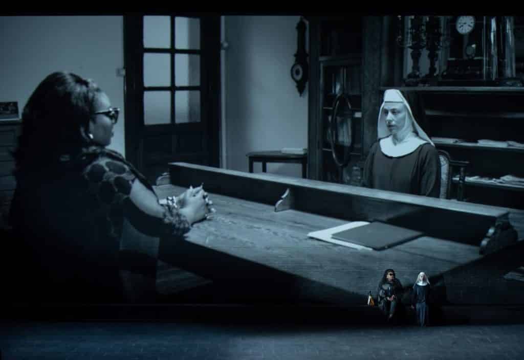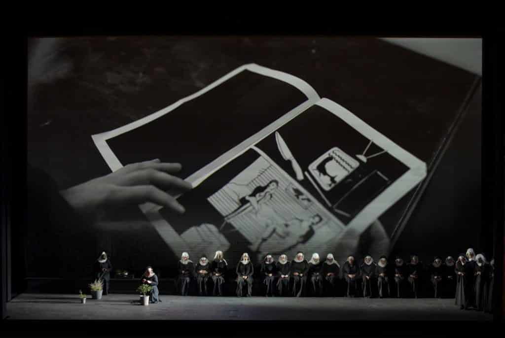 ainsi, alors que Luigi déclare à Giorgetta ne pas avoir « peur de manier le couteau et de faire couler des gouttes de sang pour [lui] en faire un joyau », Michele, qui regarde une émission amusante à la télévision dans sa cabine, part d’un grand éclat de rire, donnant l’impression de se moquer ouvertement de son rival et de tourner en dérision ses velléités de meurtre. Enfin, Suor Angelica donne à voir une utilisation de la vidéo absolument exemplaire, au point que le spectateur a l’impression d’assister à un spectacle d’un genre nouveau, forme hybride entre le théâtre et le cinéma : la scène et l’écran, loin d’être simplement, platement juxtaposés comme ils le sont presque toujours aujourd’hui à l’opéra, se prolongent l’un l’autre, les personnages semblant achever sur scène une action commencée à l’écran – ou inversement. C’est virtuose, impressionnant, et toujours au service du drame et de l’émotion.