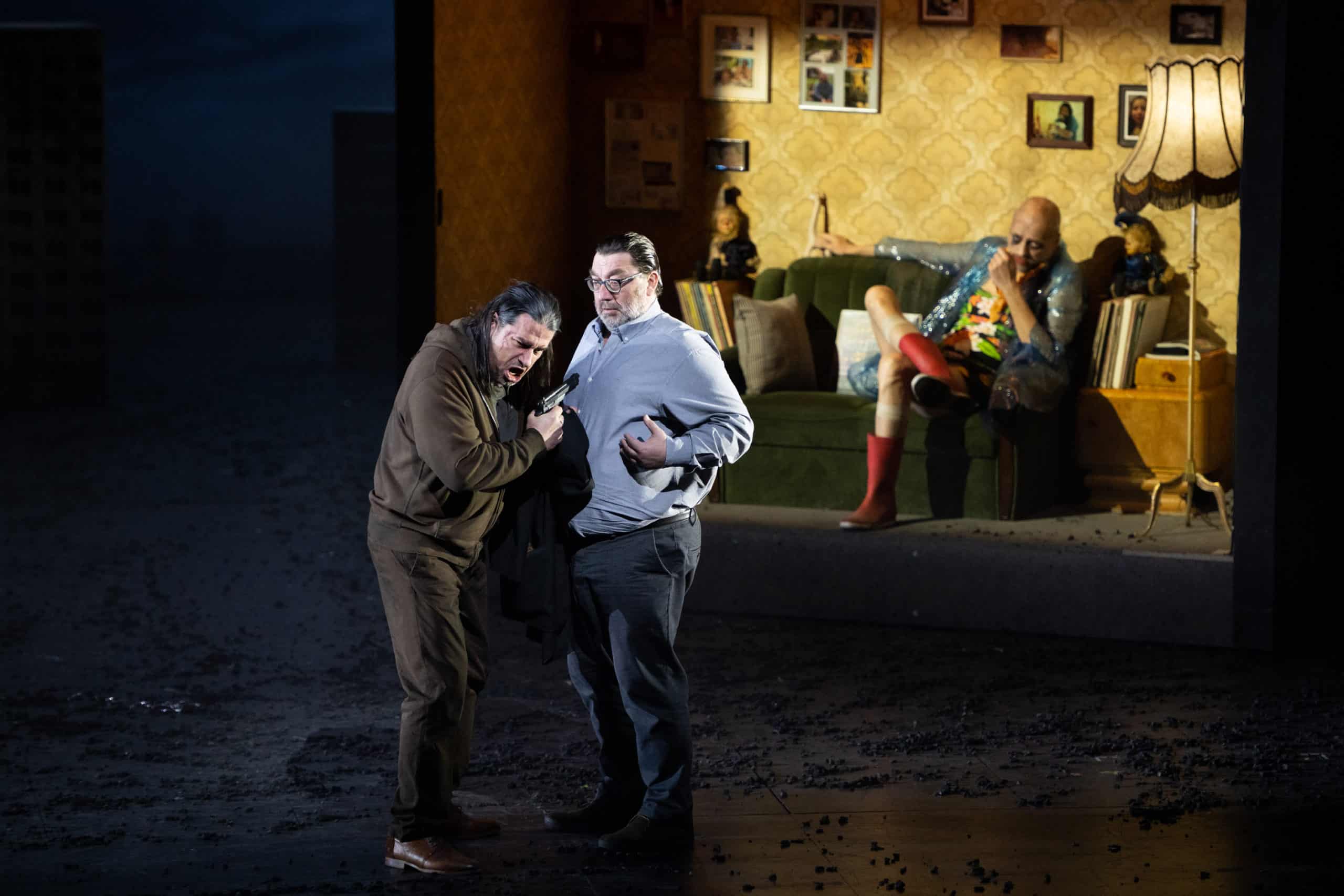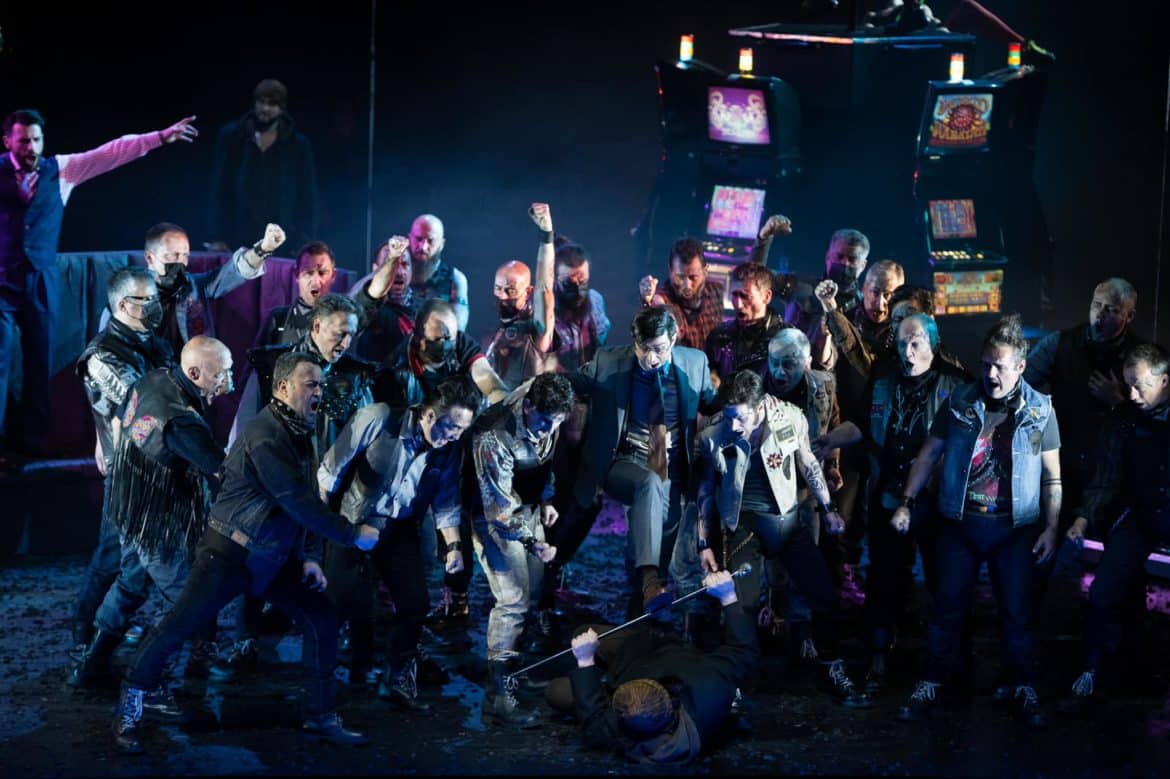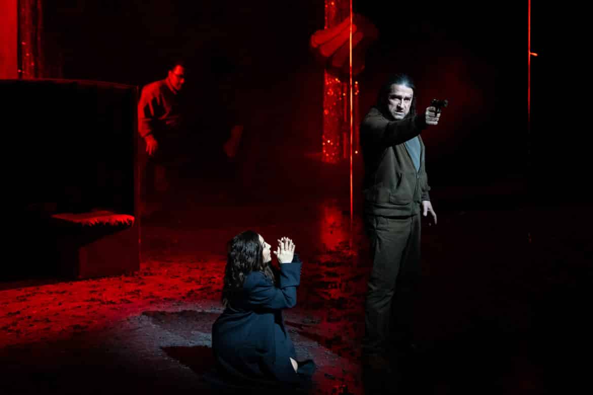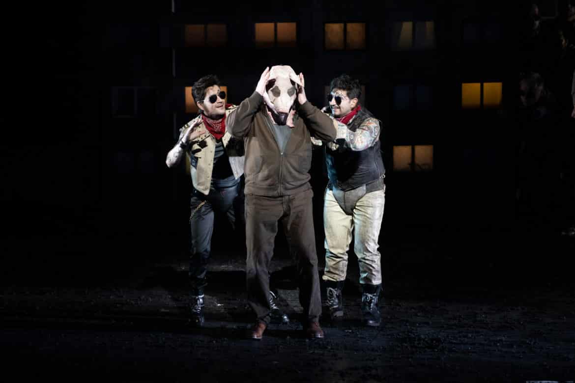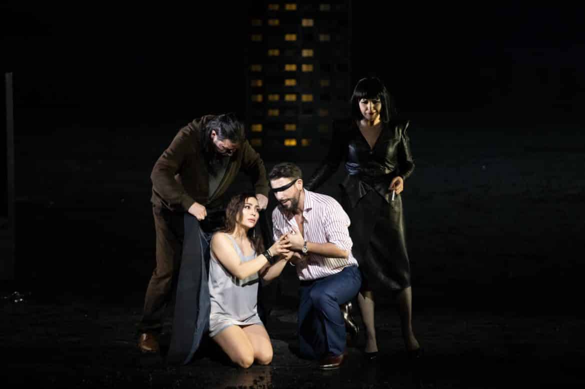Heureusement, l’oreille est à la fête grâce à la direction de Daniele Rustioni, qui creuse notamment les grands accords du Destin avec une force et une intensité stupéfiantes, faisant de l’orchestre un protagoniste essentiel du drame. Une lecture aussi puissante aurait mérité un spectacle plus stimulant, d’autant que le chœur de l’Opéra de Lyon, réduit à ses pupitres masculines, livre lui aussi une prestation de très haute tenue, malgré la vulgarité du jeu qui lui est parfois imposé. C’est également du chœur que proviennent les titulaires de plusieurs petits rôles, entre autres Sylvie Malardenti en comtesse de Ceprano, Marie-Eve Gouin en page ou Paolo Stupenengo en huissier (mais pourquoi avoir fait de celui-ci une sorte de travesti en imperméable transparent ?). Le Borsa percutant de Grégoir Mour impressionne par ses qualités de danseur, Daniele Terenzi révélant un joli timbre en Marullo. Dommage que Roman Chabaranok manque d’autorité et de projection, son Monterone passe presque inaperçu, d’autant plus que l’autre basse de la distribution est, elle, magistrale : Gianluca Buratto (en alternance avec Stefan Cerny) est un Sparafucile absolument somptueux, dont on espère qu’il trouvera bientôt à incarner les plus grands rôles du répertoire. Gaînée de cuir comme son frère, Maddalena trouve en Agata Schmidt une interprète éloquente qui sait imposer sa présence dans le quatuor du dernier acte. Dans le rôle-titre, Dalibor Jenis joue en vieux routier de toutes les ficelles du métier, son expressivité faisant oublier un grave confidentiel et pas mal de phrases plus jouées que véritablement chantées. Hélas un peu livrée à elle-même sur le plan théâtral (la direction d’acteur se borne à lui demander de faire de la balançoire et à vaguement caresser les montants du portique rouillé pendant « Caro nome »), Nina Minasyan s’affirme au fil de la représentation et propose une Gilda touchante, la couverture vocale retirant un peu d’impact à sa diction mais nous épargnant toute acidité dans le suraigu. Reste le cas d’Enea Scala : dommage que le ténor se sente obligé de systématiquement pousser sa voix, car lorsqu’il renonce à son émission en force, le timbre redevient bien plus agréable à écouter, le comédien étant tout à fait convaincant et réussissant l’exploit de rendre le Duc bien moins antipathique qu’il ne devrait le paraître.