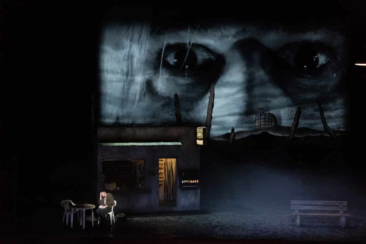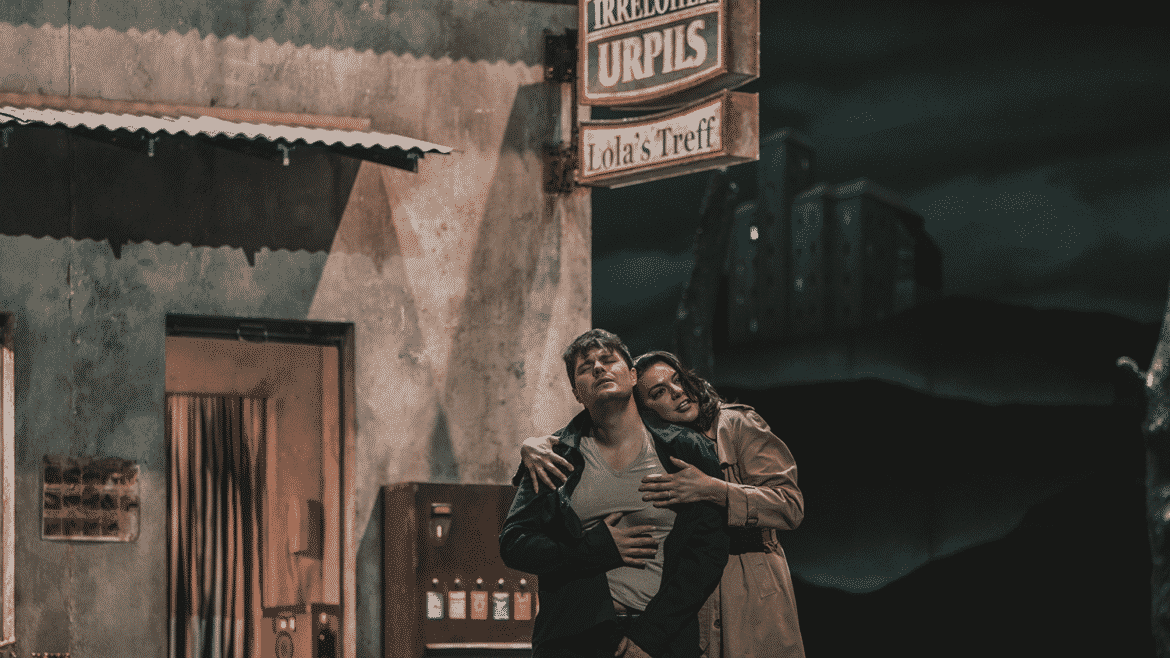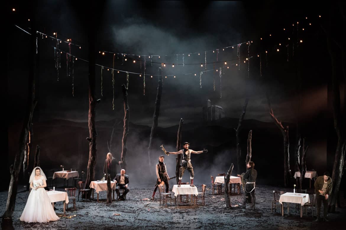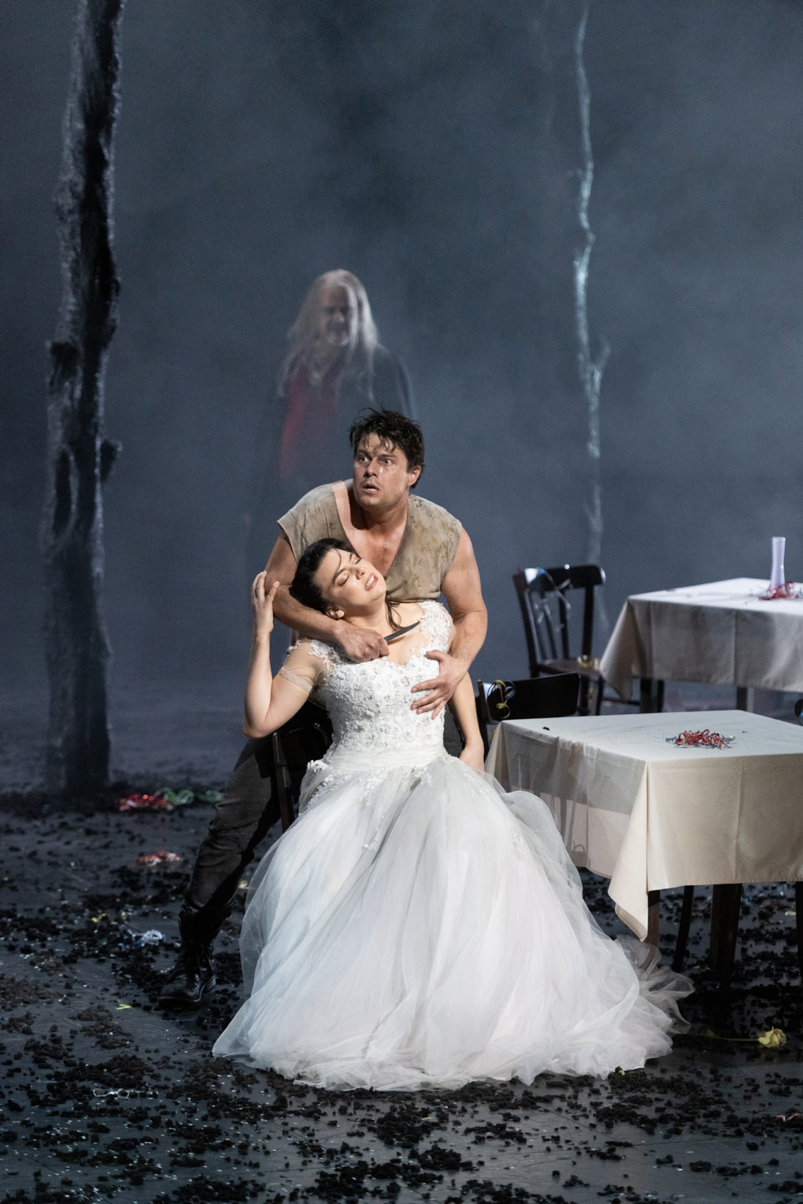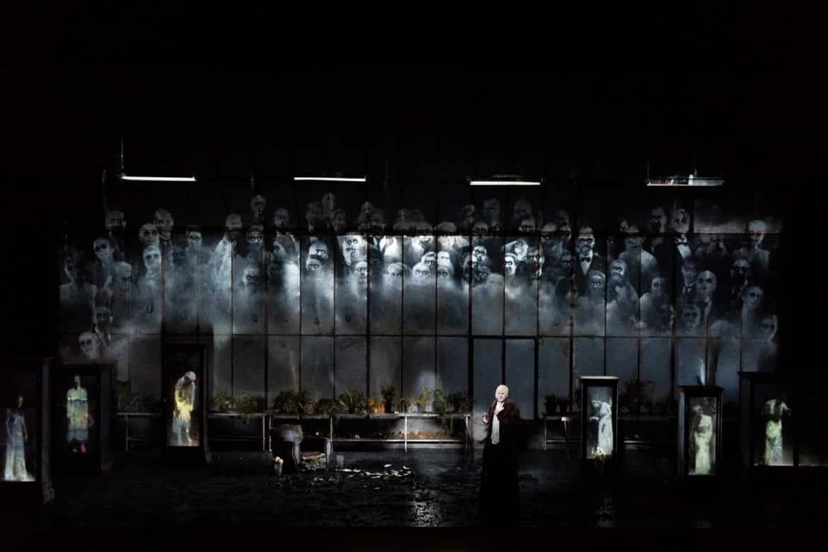 Après la création française de l’opéra de Braunfels Les Oiseaux (1920) à Strasbourg il y a quelques mois, l’encore plus rare Irrelohe de Franz Schreker (1924) est donné pour la première fois dans notre pays, grâce à la curiosité de l’Opéra de Lyon. On s’en réjouit sans en être étonné : rappelons que c’est déjà dans la capitale des Gaules que Die Gezeichneten du même Schreker avait connu sa première scénique française en 2015, dans une mise en scène de David Bösch, qui revient pour Irrelohe (avec les mêmes responsables des décors et des lumières que pour le Rigoletto également présenté dans le cadre du festival « Secrets de famille »). Pour cette histoire de malédiction familiale, de viols et d’incendies, la production renvoie à l’entre-deux-guerres à travers la référence au cinéma des années 1920 et 1930, avec un usage de la vidéo qui a l’intelligence de ne pas détourner l’attention de ce qui se passe sur le plateau : les images renvoyant à l’esthétique du romantisme hollywoodien en noir et blanc, ainsi qu’à celle des films muets, ne concurrencent pas les chanteurs et n’interviennent que lors des interludes orchestraux conçus par le compositeur pour accompagner les changements de décor. L’action est actualisée, mais en partie seulement : si la plupart des personnages semblent de notre temps, le comte Heinrich dans son mystérieux château semble vivre un siècle auparavant, entouré d’étranges zombies. Et si tout se passe dans un cadre évoquant les paysages calcinés par la Première Guerre mondiale, les trois musiciens pyromanes, avec leurs bretelles pendant sur les fesses, ont une dégaine bien plus proche de notre temps.