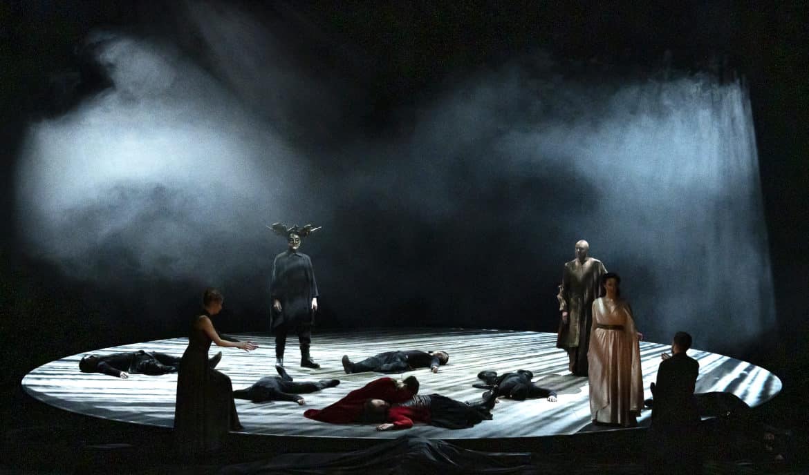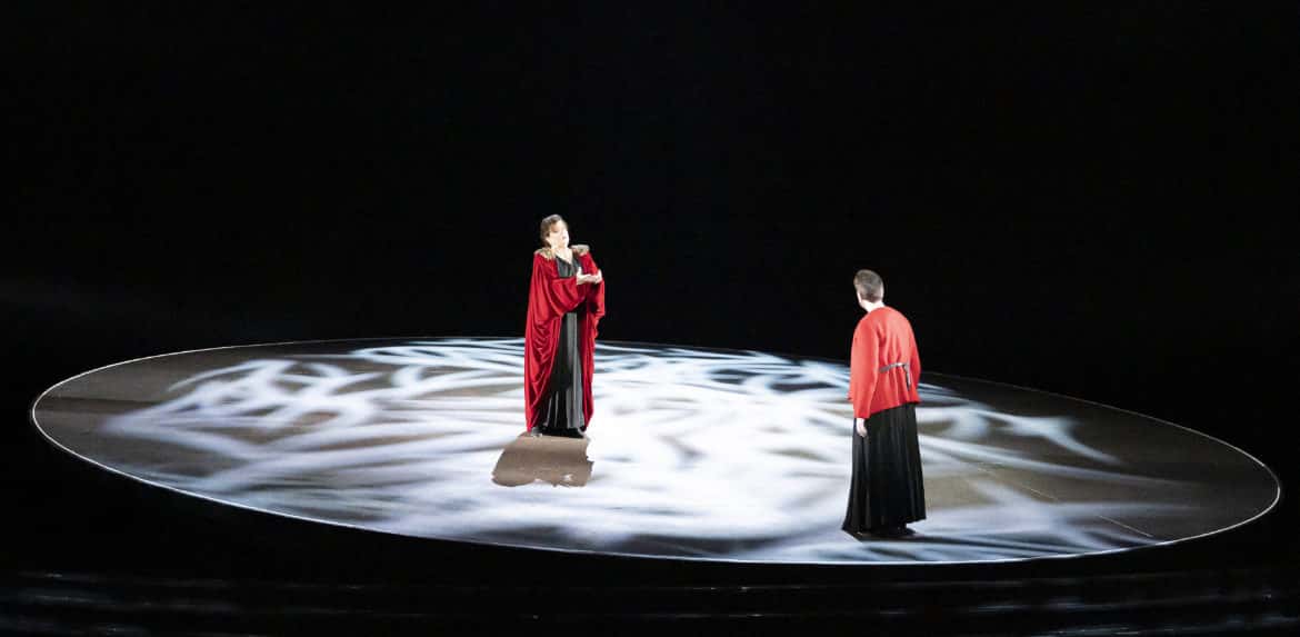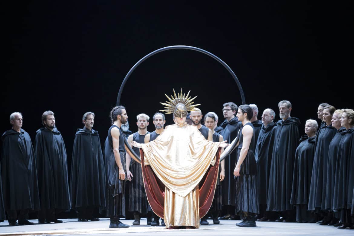 Eric Oberdorff signe ici une mise en scène sombre et poétique, puissamment suggestive et d’une intemporalité morale telle un îlot d’éternité au sein d’un monde et d’une actualité toujours changeants. Extrêmement chorégraphiée et sans cesse en mouvement, l’action prend vie autour, sur et en-dessous d’une tournette déjà aperçue dans une production de l’Opéra de Nice,  Akhnaten, autre sujet solaire s’il en est. Pour animer ce plateau mouvant, le metteur en scène met à contribution deux circassiens et quelques danseurs contemporains de la Compagnie Humaine.  À la fois danseurs et acteurs du drame à l’égal des solistes et du chœur, la qualité de leur réalisation technique ne lasse pas de subjuguer.