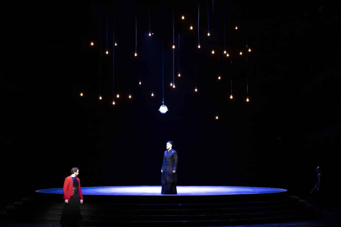 Tout, où plutôt un rien, suffit à créer un espace et un temps hors du monde et ouverts à toutes les interprétations. Sur ce plateau dépouillé, seules les lumières fortes et focalisées de Jean-Pierre Michel départagent la tournette et les autres espaces. Les décors et costumes de Bruno de Lavenère interrogent également la temporalité et la localité de cette histoire qui pourrait se jouer dans l’Antiquité aussi bien que sur une planète futuriste. Ce dépouillement et cette clarté mettent l’accent sur les personnages, la musique et le mouvement.
