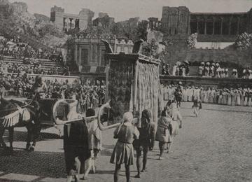 La scénographie imposante des réalisations biterroises – décors peints de 3.000 m2, 450 instrumentistes et 250 choristes occupant divers plateaux pour évoquer la Perse de Parysatis – innove en préfigurant les futurs péplums cinématographiques. La grandiloquence de cette antiquité « kitsch » touche un large auditoire socialement mixte puisque la jauge des arènes est d’environ 12.000 spectateurs ! Une décennie plus tard, Saint-Saëns signe l’une des premières musiques de film avec un sujet également historique, L’assassinat du duc de Guise, film muet d’A. Calmettes et C. Le Bargy (1908).