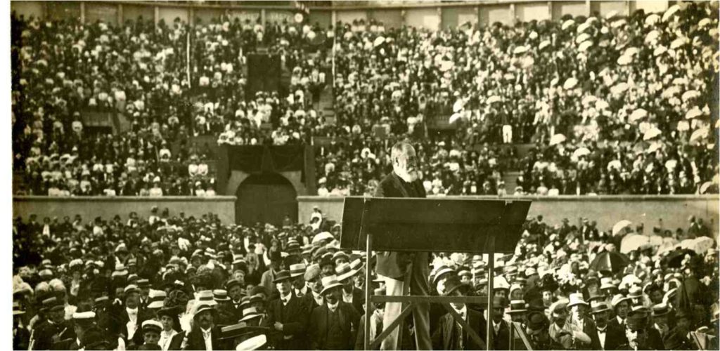 Saint-Saëns au pupitre de chef dans les Arènes de Béziers, photo ca 1900 (Archives de Béziers)