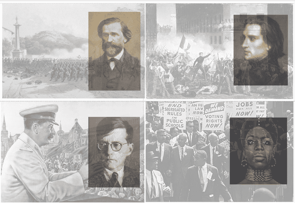 En 1848, lors du soulèvement piémontais contre l’occupant autrichien, G. Verdi n’hésitait pas lorsqu’il écrivait au librettiste Piave : « Tu me parles de musique ? Où as-tu la tête ? Penses-tu qu’en ce moment, je m’occupe des notes et des sons ? En 1848, nulle musique ne saurait plaire davantage aux oreilles italiennes que le son du canon ! Je n’écrirais pas une note pour tout l’or du monde, j’aurais un immense remords à consommer du papier à musique, qui excelle à faire des cartouches. »