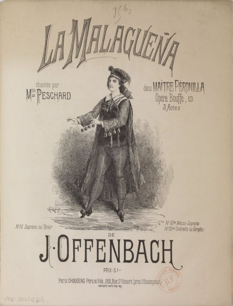Quelle est, dans ce contexte-là, la place de Maître Péronilla, créé en mars 1878 aux Bouffes-Parisiens ? Intitulée « opéra-bouffe », l’œuvre ressortit par plusieurs aspects au genre de l’opéra-comique, comme l’explique Gérard Condé dans son texte de présentation, notamment par son orchestration délicate et raffinée. Mais elle emprunte aussi, plus ou moins directement, à certains opus antérieurs du maître… Malgré son titre, Maître Péronilla n’est pas une œuvre axée sur une figure forte, comme ce fut le cas avec les personnages éponymes de la Grande-Duchesse, la Périchole, Hélène de Troie, ou comme ce sera bientôt le cas avec Hoffmann… C’est, au contraire, une œuvre « d’équipe » (elle compte pas moins de 26 personnages !), sans véritable héros ou héroïne, comme La Vie parisienne ou encore Les Brigands. Le livret et la musique s’inspirent d’ailleurs ponctuellement de ces deux œuvres : le « Fermons l’oreille, / Fermons les yeux » de Ripardos est presque une citation des couplets du maître d’hôtel de La Vie parisienne ; le rondeau de Frimouskino « Je pars, je vais, je vole », dans lequel le jeune homme raconte ses aventures sur un rythme effréné, est l’exact pendant du « Falsacappa, voici ma prise ! » de Fragoletto (Les Brigands). La Grande-Duchesse est également sollicitée (Ripardos, dans ses couplets, fait rimer « moustache » et « panache », comme le général Boum, et Manoëla chante une philosophie qui est aussi de mise à Gérolstein : « Quand on n’a pas ce que l’on aime, / Il faut aimer ce que l’on a ! »). La romance d’Alvarès (« Quand j’ai dû, la mort dans l’âme ») revêt quant à elle les couleurs nocturnes du chant d’Elsbeth dans Fantasio, et l’air de Maître Péronilla rappelle la mélodie des couplets du « tailleur amoureux » de La Fille du Tambour-Major. Mais c’est aussi des compositeurs italiens qu’Offenbach s’inspire : le terzetto du premier acte (« Quelle est donc cette joie ? »), entre un soldat et un couple de jeunes amoureux tentant d’échapper à un mariage qui les séparerait rappelle bien sûr de très près le trio entre Tony, Sulpice et Marie  (« Tous les trois, réunis, / Quel plaisir, mes amis ! ») dans La Fille du régiment (1840) – voire celui entre Almaviva, Rosine et Figaro au second acte du Barbier. L’Espagne de Maître Péronilla est d’ailleurs en partie celle de Beaumarchais et de son Figaro, le personnage du juge bègue Brid’Oison étant directement emprunté au Mariage de Figaro.