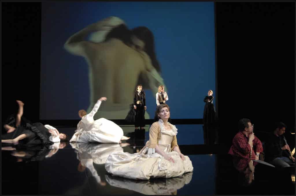 Moins évidentes, l’adaptation du Manteau, conte du nouvelliste russe, en Go-gol, ou encore celle de Penthesilae d’H. von Kleist vers Scènes de chasse de R. Koering, immergent le spectateur dans les hallucinations romantiques avec un langage musical du présent. Tandis que Les Noces de sang de C. Chaynes sont imprégnés de la violence poétique de F. Garcia Lorca, le non-sens burlesque de La Cantatrice chauve [1] est abordé avec un humour distancié par G. Calvi :