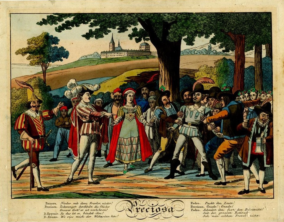 En Espagne. Un jeune noble tombe amoureux d’une belle gitane et se joint à sa bande afin de pouvoir rester auprès d’elle. On découvrira par la suite que Preciosa est elle-même d’origine noble : aucun obstacle ne s’opposera plus alors à leur union.