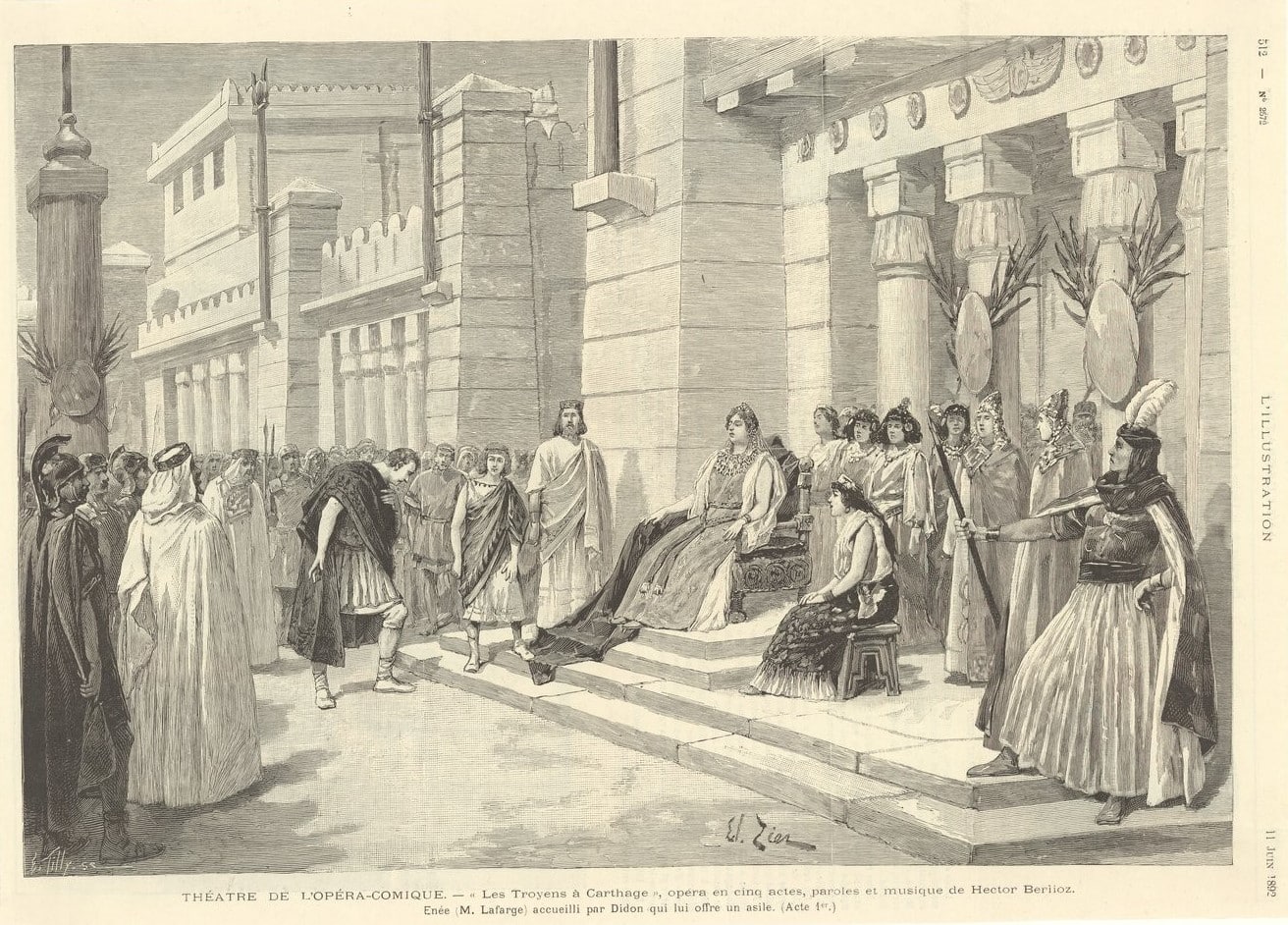 Théâtre de l'Opéra-Comique, « Les Troyens à Carthage », Enée, M. Lafarge, accueilli par Didon qui lui offre un asile. Estampe d’E. Zier (dessinateur) et E. Tilly (graveur), L’Illustration, 1892 – © BnF/Gallica
