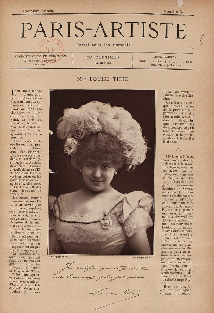 Il y a cent ans jour pour jour disparaissait LOUISE THÉO (1850-1922), qui fut une célèbre interprète d’Offenbach mais aussi de Lecoq ou Messager.