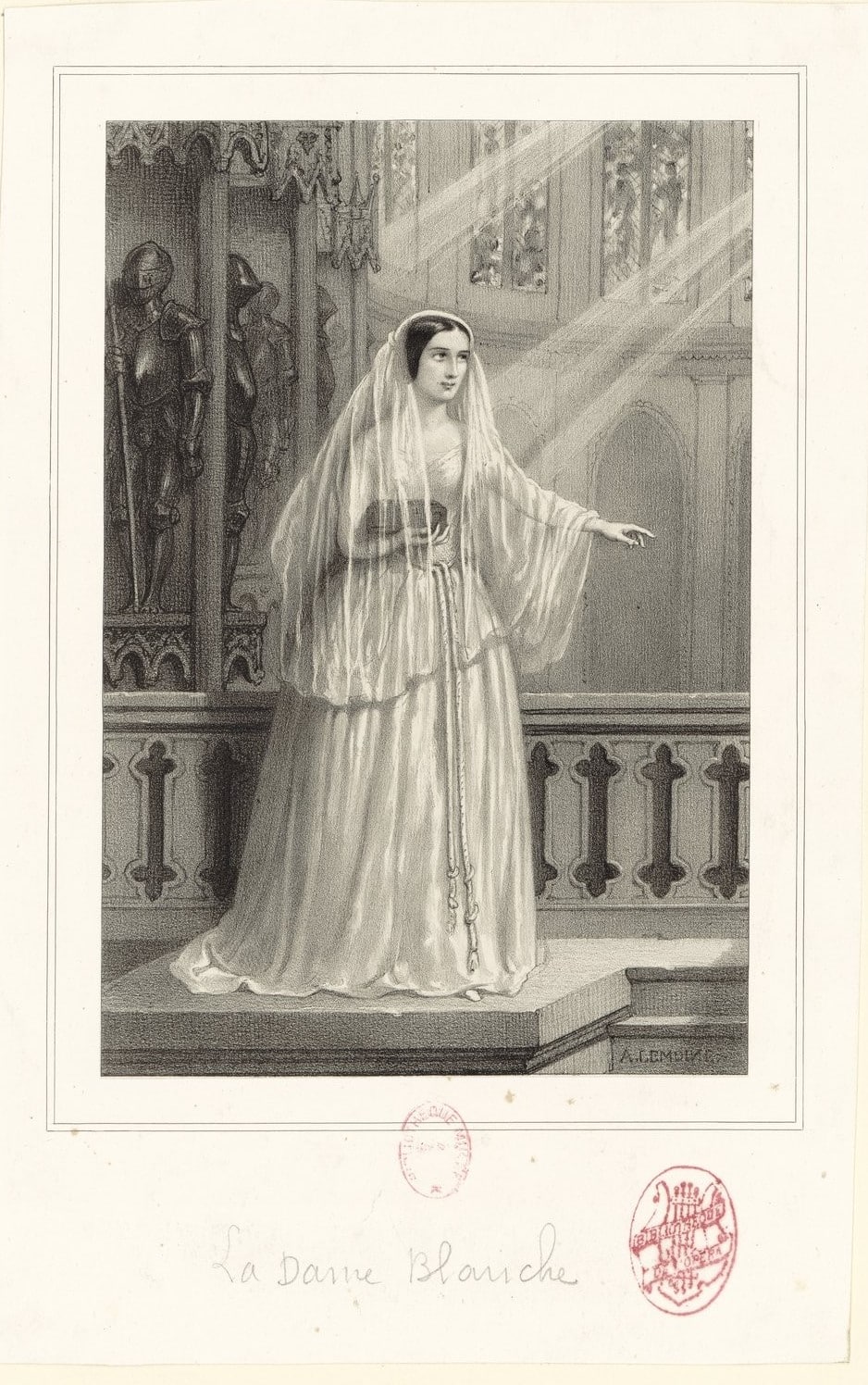 Scribe puise dans deux romans de Walter Scott : l’essentiel de la trame narrative est vaguement inspirée de Guy Mannering, le second roman de l’écrivain écossais (paru en 1815 et traduit en français dès 1816). Mais en ce début de XIXe siècle, la mode est aux romans gothiques, et un goût prononcé pour le fantastique se fait jour (dès 1797, la première traduction française du Moine de Lewis avait paru, de même que certains titres d’Ann Radcliffe…). Aussi Scribe, exploitant cet engouement pour l’étrange et le surnaturel, emprunte-t-il également à un autre roman de Scott (Le Monastère, 1820 ) la figure fantomatique d’une mystérieuse « dame blanche »…
