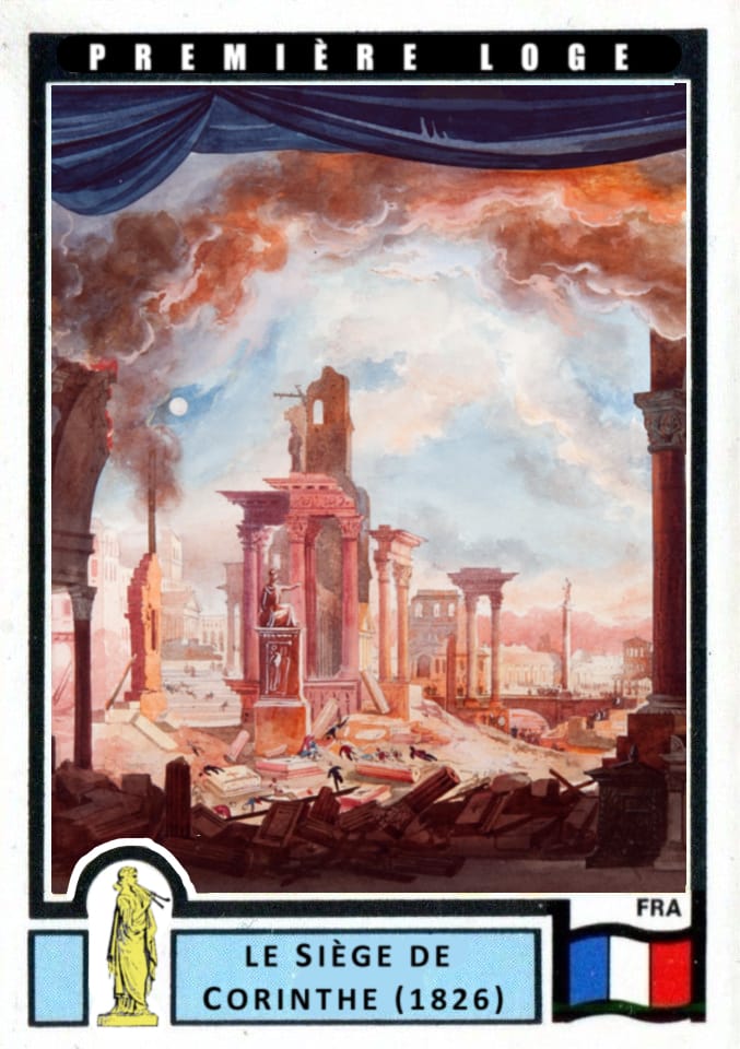 Fort du bon accueil réservé à son Voyage à Reims (créé aux Italiens le 19 juin 1825), Rossini, un an plus tard, propose au public français un nouvel opéra, cette fois-ci sur un livret français, qui marquera son entrée à l’Opéra de Paris : ce sera Le Siège de Corinthe (paroles de Luigi Balocchi et Alexandre Soumet, dramaturge auteur de Norma, tragédie en 5 actes dont s’inspirera le librettiste Felice Romani pour l’opéra homonyme de Bellini), dont la création a lieu salle Le Peletier le 9 octobre 1826. Tout est réuni pour que le spectacle soit un succès : des décors et des costumes somptueux, et surtout une distribution brillantissime. Laure Cinti-Damoreau (soprano) interprète Pamyra, Henri Étienne-Derivis (basse) Mahomet II, Adolphe Nourrit (ténor) Néoclès. L’œuvre est une adaptation de Maometto II, qui avait été créé au San Carlo de Naples en 1820, sans rencontrer le succès escompté par le compositeur.