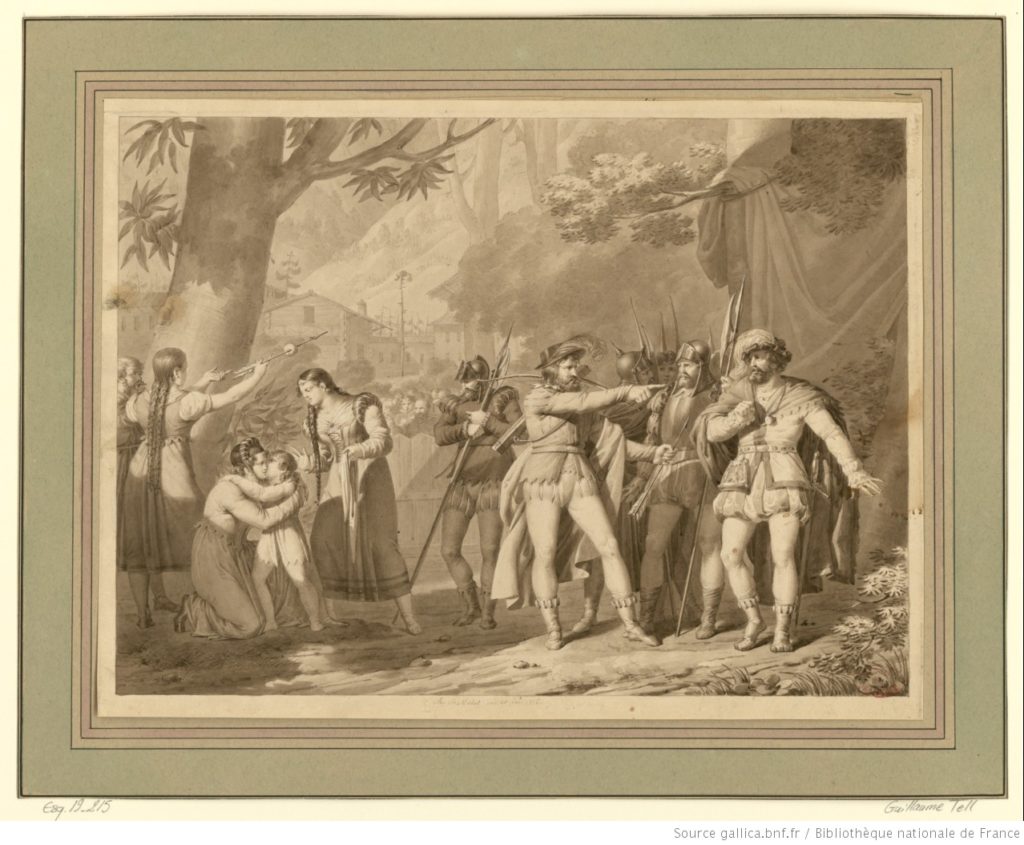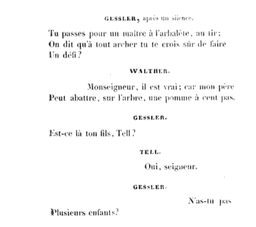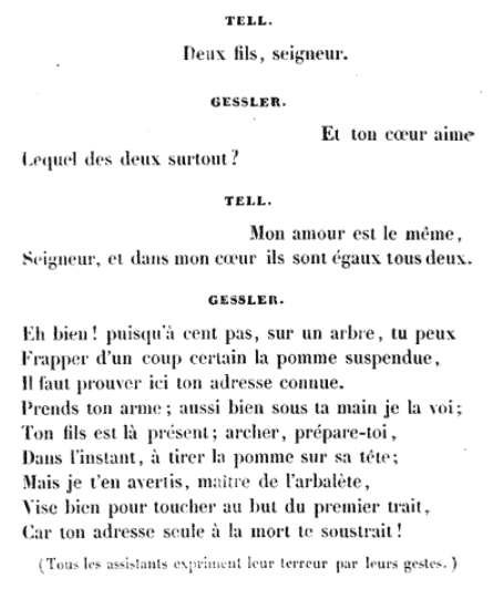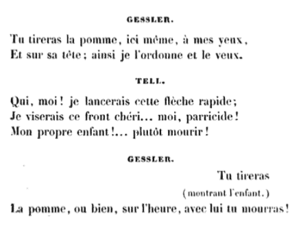 Friedrich von Schiller, Guillaume Tell, Acte III scène 3, traduction en vers de Jules Mülhauser, 1838 (l’épreuve de la pomme).