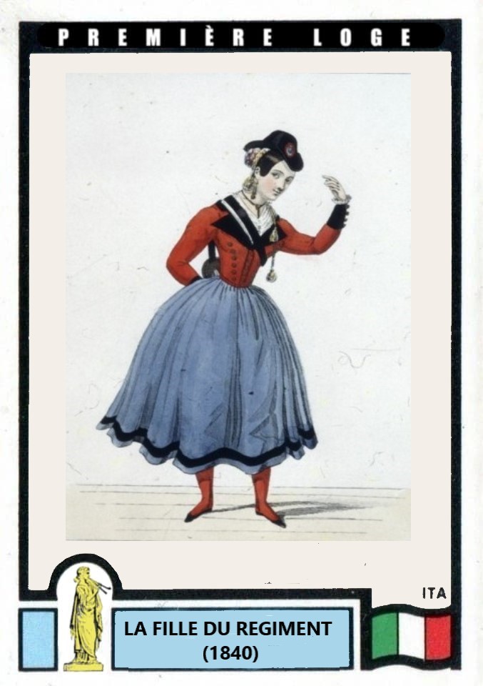 Au début de l’année 1840, l’Opéra-Comique est installé salle de la Bourse (rue Vivienne, en face de la Bourse de Paris), en attendant la réouverture de la salle Favart qui avait été détruite par le feu. C’est dans cette salle qu’est créée La Fille du régiment le 11 février 1840, avec une distribution assez médiocre : Euphrasie Borghèse [1] (Marie, la seule à avoir vraiment remporté un certain succès), Mécène Marié de l’Isle (Tonio ; il s’agit du père de Célestine Galli-Marié, créatrice de Carmen) et Henry Deshaye (Sulpice). Le succès n’est guère au rendez-vous. D’après le critique de La Revue et Gazette musicale de Paris (jeudi 13 février 1840) qui évoque une « peu mémorable représentation », la production avait souffert d’une mise en scène, de décors et de costumes peu soignés. Donizetti avait par ailleurs subi une cabale de la presse parisienne l’accusant (injustement) de recycler dans son opéra-comique des pages composées antérieurement pour d’autres œuvres, et les insultes violentes, méprisantes, de mauvaise foi – et teintées d’une italophobie parfaitement assumée – d’un Berlioz vexé de voir son confrère italien programmé dans plusieurs salles parisiennes : « M. Donizetti a l’air de nous traiter en pays conquis, c’est une véritable guerre d’invasion. On ne peut plus dire : les théâtres lyriques de Paris, mais seulement : les théâtres lyriques de M. Donizetti » (Journal des débats, 16 février 1840).