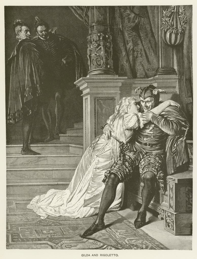 Le Duc a appris que Gilda a disparu, il s’en émeut avant d’apprendre que ce sont ses propres courtisans qui l’ont enlevée et conduite au Palais. Arrive Rigoletto qui, face aux courtisans, commence à les insulter (« Cortigiani, vil razza dannata ! ») avant de les supplier de lui rendre sa fille (« Miei signori, perdono, pietate ! »).