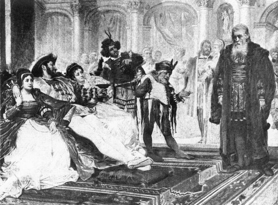 La fête est interrompue par l’irruption du vieillard Monterone, qui accuse le Duc d’avoir déshonoré sa fille. Rigoletto tourne ces accusations en dérision et ridiculise Monterone. Le vieillard jette alors sa malédiction sur le bossu, profondément impressionné par la scène.