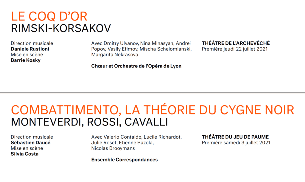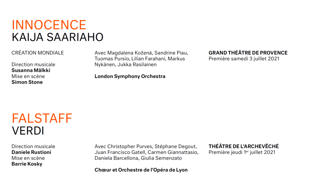 Côté chanteurs, on pourra applaudir Nina Stemme, Jamie Barton, Julie Fuchs, Lea Desandre , Sandrine Piau, Stéphane Degout, Valerio Contaldo, Leo Nucci, Francesco Meli ou encore Magdalena Kožená.