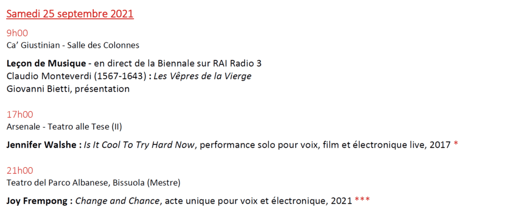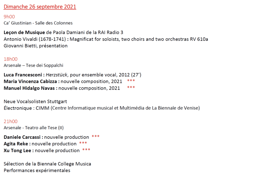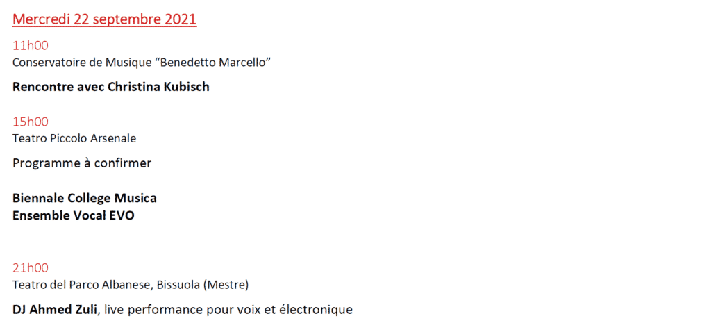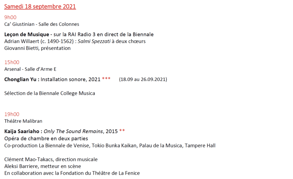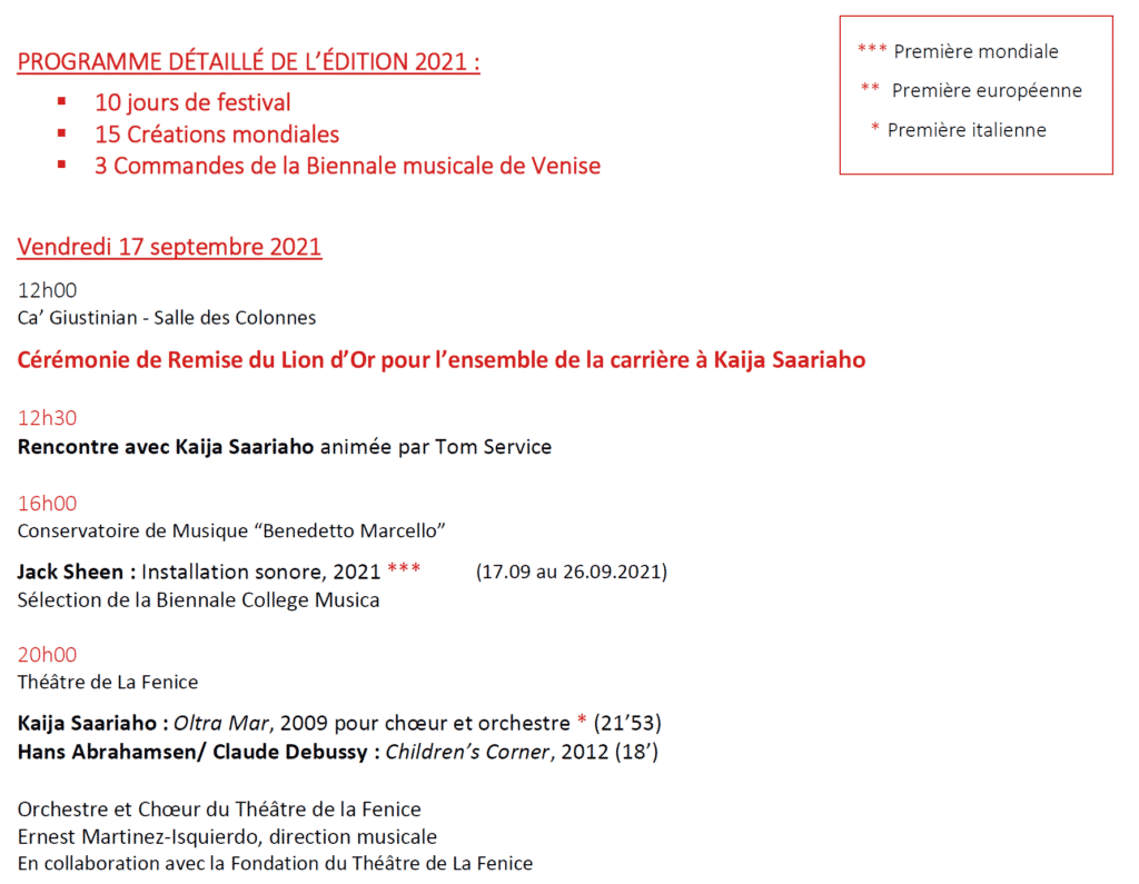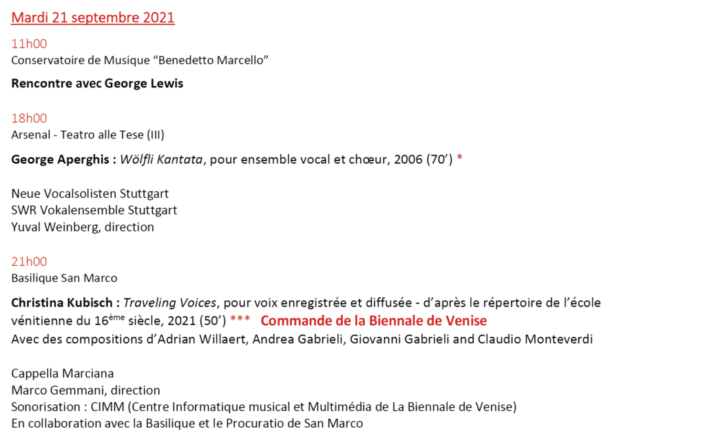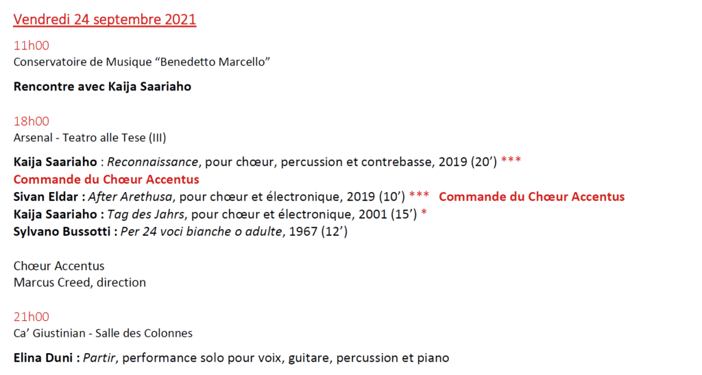 Au programme, 15 créations mondiales de Kaija Saariaho (Lion d’Or 2021) ; Sivan Eldar ; Francesco Filidei ; Marta Gentilucci ; Christina Kubisch ; George Lewis ou Sergej Newski (pour n’en citer que quelques uns) dont 3 Commandes de la Biennale de Venise.