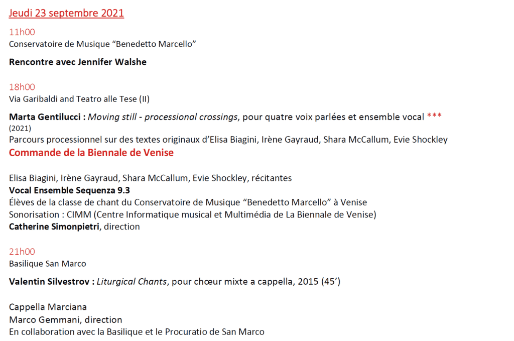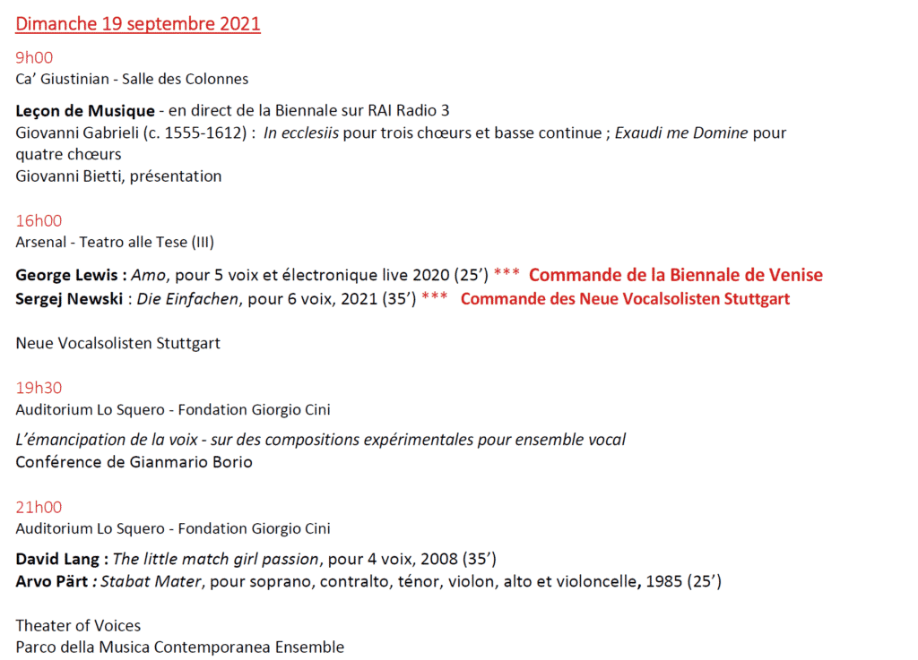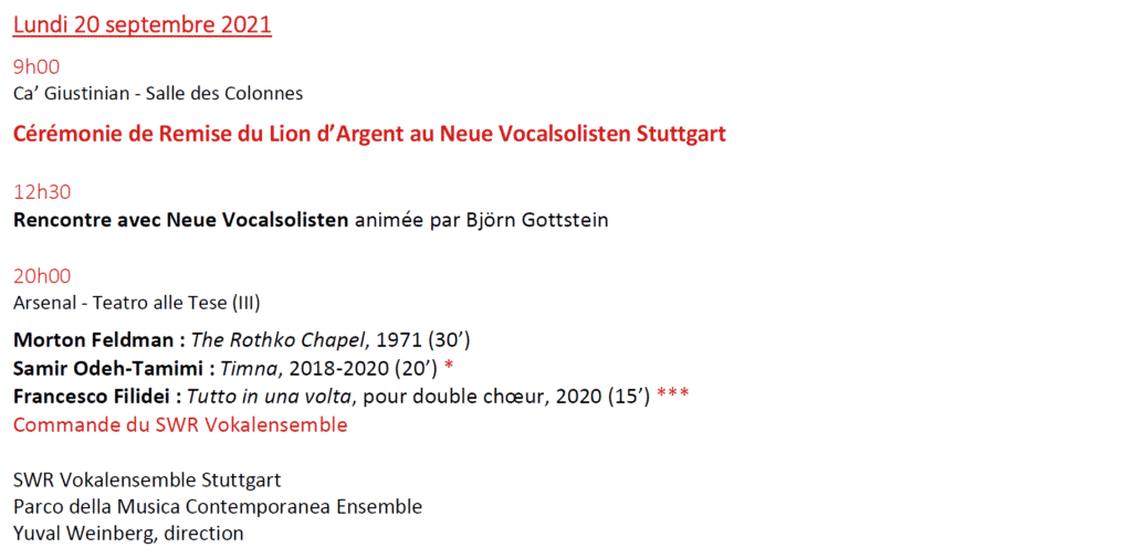 Ensembles vocaux et chœurs parmi les plus importants d’Europe participent à cette édition, tel que le Theatrer of Voices de Copenhague, les Neue Vocalsolisten de Stuttgart (Lion d’Argent 2021), le Chœur Accentus, l’ensemble vocal Sequenza 9.3, le SWR Vokalensemble de Stuttgart ainsi que les célèbres chœurs vénitiens, La Cappella Marciana de San Marco ainsi que le Chœur du Théâtre de la Fenice.