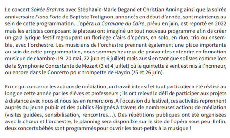 Hélas, la pandémie a rapidement mis un terme à ce bel élan… Mais il en fallait plus pour décourager l’Opéra de Tours, qui annonce, pour célébrer la réouverture des théâtres, un festival qui courra sur trois mois (de mai à juillet prochains), avec la venue de grands noms du lyrique mais aussi de jeunes talents plus que prometteurs : sont en effet attendus, entre autres, Véronique Gens, Jodie Devos, Angélique Boudeville, Florie Valiquette, Marie Perbost, Enguerrand de Hys, Mathias Vidal ou encore Chantal Santon Jeffery.