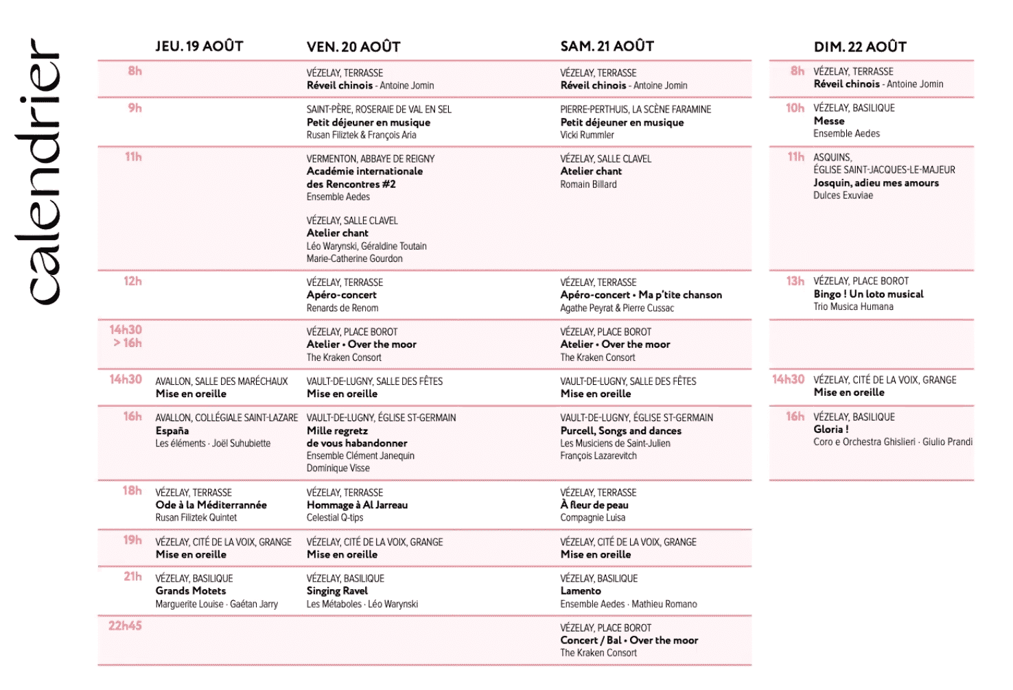 La 21e édition des rencontres musicales de Vézelay se déroulera cette année du 19 au 22 août. 19 concerts, 33 évènements sur 4 jours, avec des moments gratuits pour profiter du village et prolonger des thématiques alléchantes.