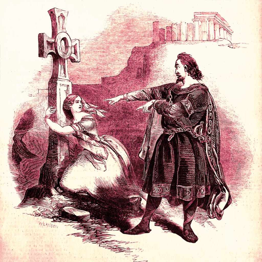 Alors qu’on festoie à l’occasion d’un tournoi qui doit prochainement avoir lieu  – et dont le prix est la main d’Isabelle, fille du roi de Sicile -, Raimbaut, un troubadour, chante la légende de Robert le Diable, un chevalier qui serait né de l’union d’une princesse normande avec un démon.